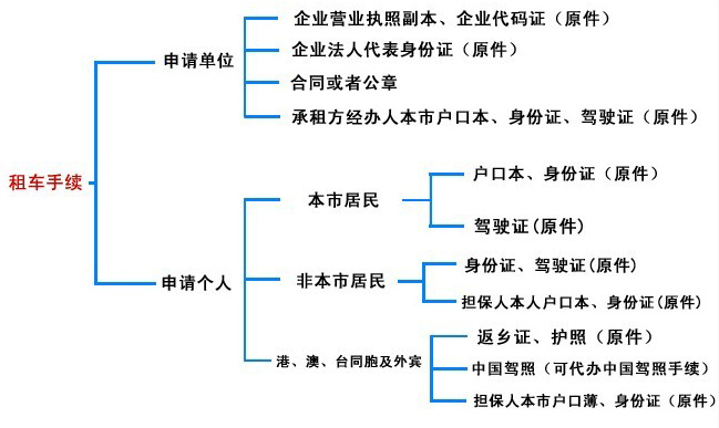 1 、單位租車須交驗營業執照副本、法定代表人授權委托書、法定代表人身份證、企業代碼、單位公章、單位證明及經辦人身份證、戶口本、用車人的駕駛證、一寸紅底免冠照片二張(必須由我公司委派司機親臨貴公司辦理)。